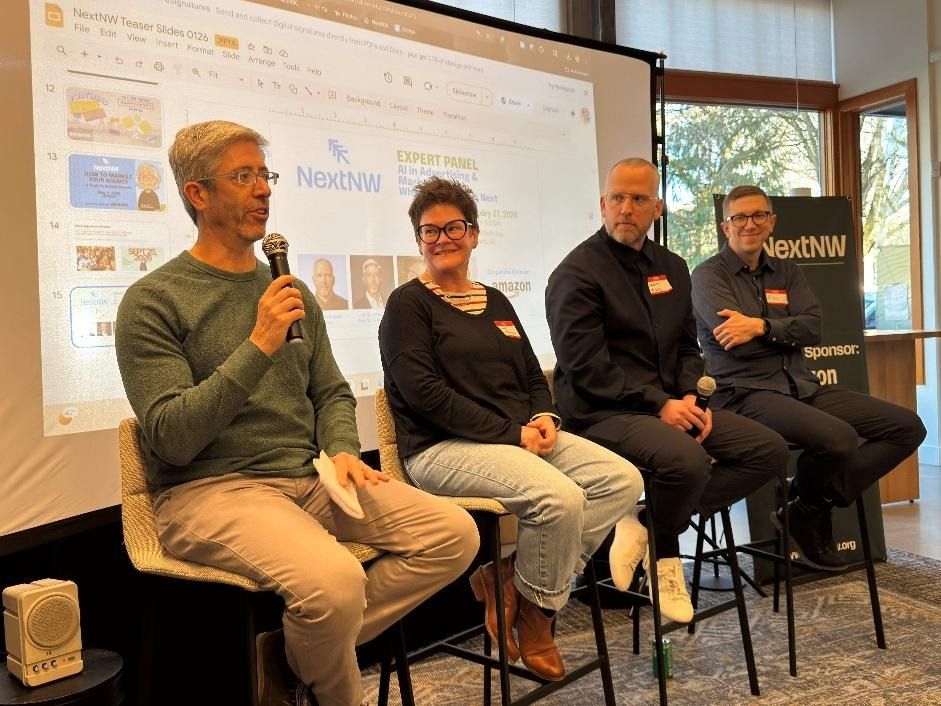 On January 21st, 2026, NextNW hosted a panel of AI experts and asked a host of questions from the advertising, marketing and creative industry perspective. Our seasoned panelists included Mike Houston, Janet Lee Johnson, Jordan Plawner, and Garett Stenson. A summary of their answers to our questions are below.