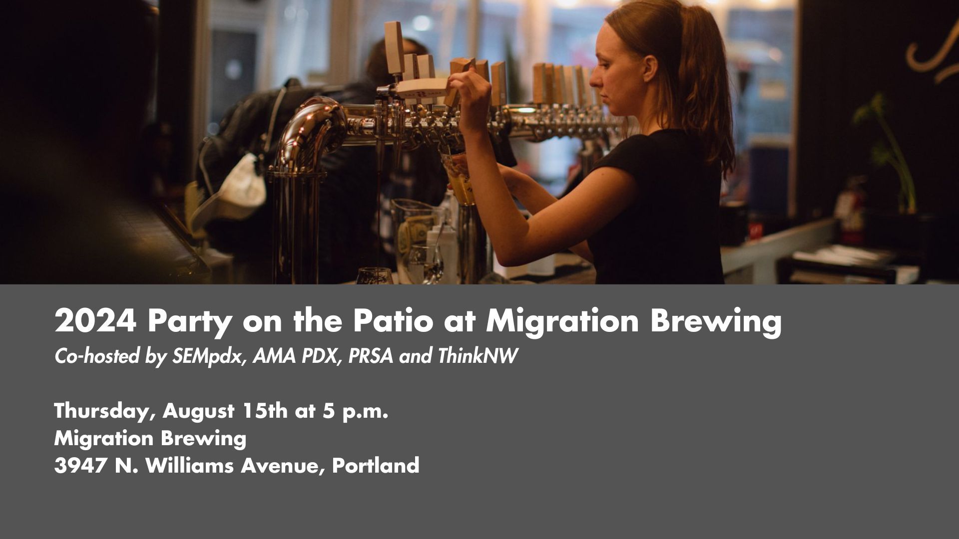 Join SEMpdx, AMA PDX, PRSA, and ThinkNW for the 13th annual networking Party on the Patio at Migration Brewing, featuring food, drinks, games, and a raffle benefiting Taking OwnershipPDX.