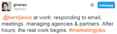 If I spend 80 percent of my day in meetings and the remaining 20 percent on email, then when do I get the work done? After hours, as Gina mentions above. I’m not alone, according to research. Nearly 9 in 10 marketers (89 percent) log in to work/work email outside of standard business hours during a typical work week. Here are a few additional compelling statistics about how marketers spend their day: