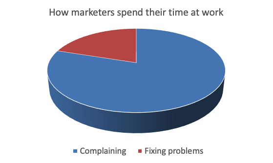 A recent global study by Asana of more than 10,000 office workers, reveals marketers waste nearly seven hours each week on pure duplication of work. Only 28 percent of marketers’ time is spent doing the job they were hired to do. Marketers also believe nearly two-thirds of the four and a half hours spent in weekly meetings are unnecessary. Over 60 percent of marketers’ time is spent on low-value or unnecessary tasks such as searching emails for information, managing shifting priorities, sitting in meetings and communicating about the status of projects. The following chart illustrates how I believe we spend time at work, based on my experience: