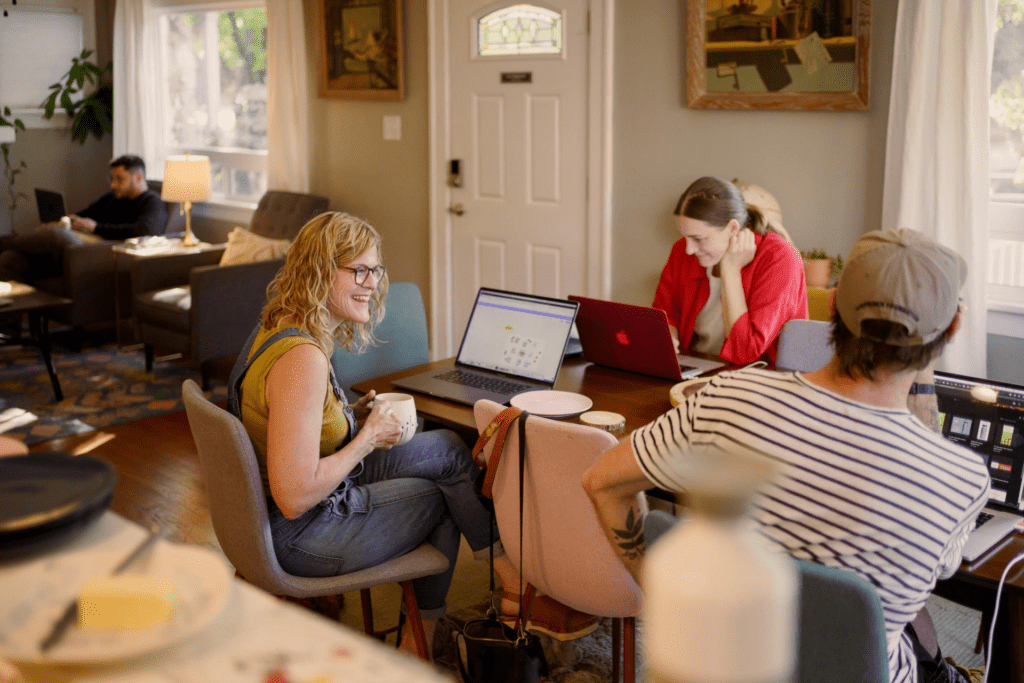 When we get to the space, there's the smell of banana bread and the promise of an excellent lunch. We meet as a team to talk about the state of the agency, and then we split into smaller work groups. The latest property we booked had several breakout rooms, so we could easily split up for various purposes.